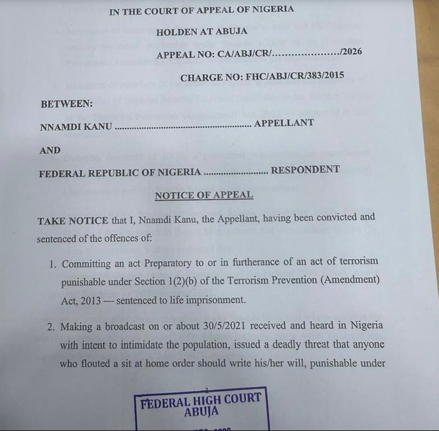 The leader of the Indigenous People of Biafra, Nnamdi Kanu, has appealed his conviction and life sentence.