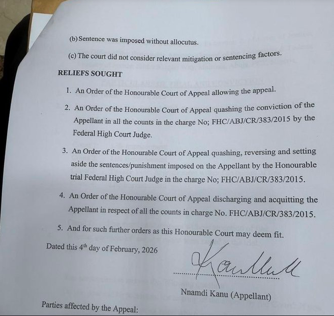 The appeal is expected to challenge both the legal process that led to Kanu’s conviction and the severity of the life sentence imposed on him. While full details of the grounds of appeal have not yet been made public, his legal team has consistently argued that his trial violated constitutional provisions, including issues surrounding jurisdiction, due process, and his extraordinary rendition back to Nigeria.